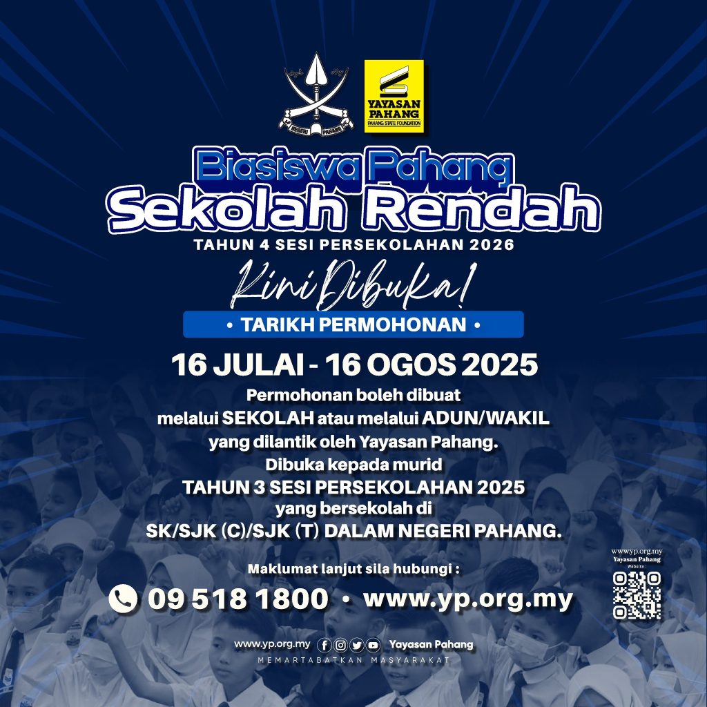 Maklumat lanjut mengenai Biasiswa Pahang (Sekolah Rendah) 2026, sila layari laman web Yayasan Pahang di link berikut https://www.yp.org.my/ atau menghubungi 09-518 1800.